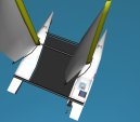 The stress frame, of course, did not only serve to eliminate the main beam; it removed the high loads of rigging (and particularly forestay) attachments from unfair positions on the hulls. With the biplane rig, the question arises whether to stay it, and if so how - there isn't much width to stay a biplane rig on its outboard side.